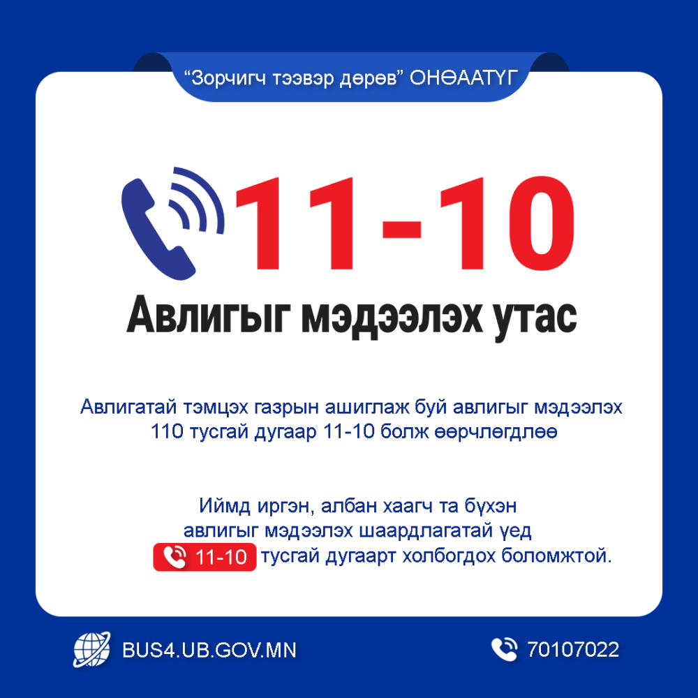 Авлигатай тэмцэх газрын ашиглаж буй авлигыг мэдээлэх 110 тусгай дугаар 11-10 болж өөрчлөгдлөө. Авлигатай тэмцэх газрын одоо ашиглаж буй 110 тусгай дугаарыг 2026 оны 3 дугаар сарын 1-ний өдрийг хүртэл давхар ажиллуулах бөгөөд дээрх хугацаанаас хойш 110 дугаар хаагдаж, 11-10 дугаар ердийн горимоор урьдын адил ажиллах юм. Иймд иргэн, албан хаагч та бүхэн авлигыг мэдээлэх шаардлагатай үед 11-10 тусгай дугаарт холбогдох боломжтой.